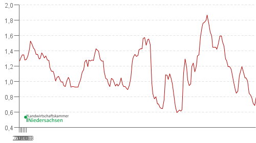 Schlachtsauenpreis der Vereinigung der Erzeugergemeinschaften für Vieh und Fleisch (VEZG), Basispreis ab Hof in €/kg Schlachtgewicht