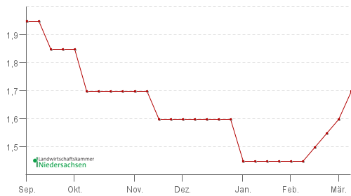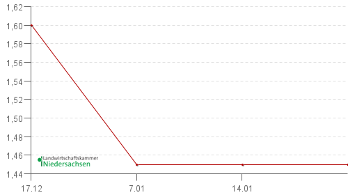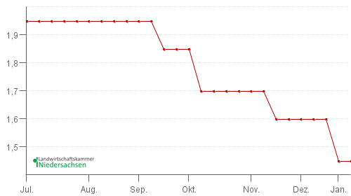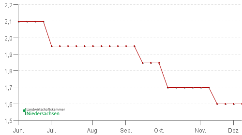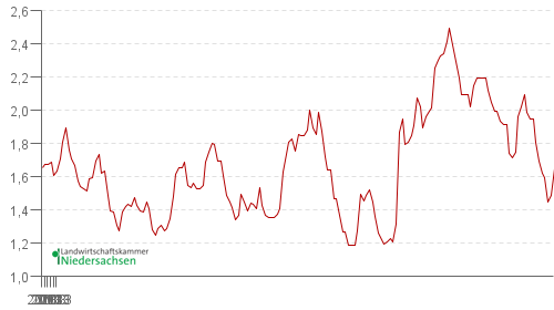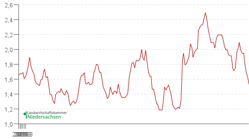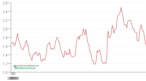 Schlachtschweinepreis der Vereinigung der Erzeugergemeinschaften für Vieh und Fleisch (VEZG), €/kg Schlachtgewicht